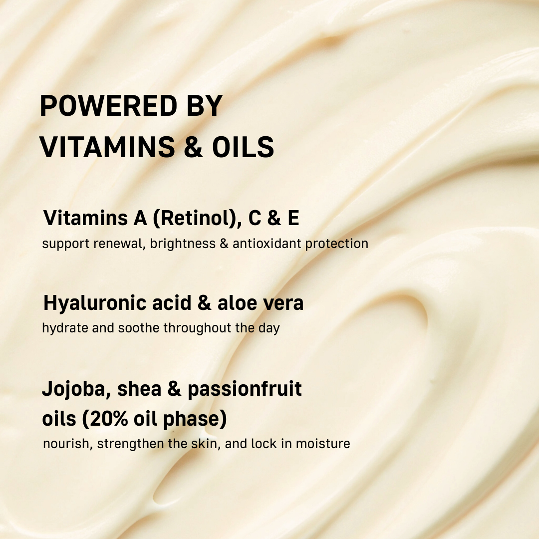Enriched with hyaluronic acid and aloe vera, the cream ensures your skin stays hydrated throughout the day. Jojoba, shea, and passion fruit oils leave the skin feeling soft, smooth, and nourished, with a healthy glow.