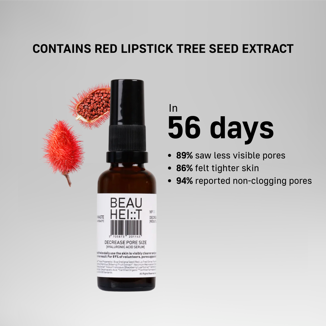 Enlarged pores and blemishes can contribute to uneven skin texture and excess oil production. BEAUHEI::T Decrease Pore Size № 114 is a lightweight, fast-absorbing booster serum designed to visibly reduce pore size, refine skin texture, and improve hydration. Formulated with Cranberry extract, Red Lipstick Tree seed extract, and multi-molecular Hyaluronic Acid, this targeted treatment helps clear congested pores, control oil, and support blemish-prone skin.