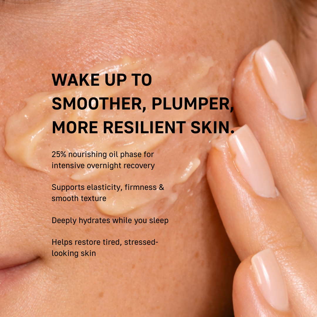 This highly active Overnight Facial Mask restores firmness and deeply hydrates. It contains 25% oil phase making it very rich but leaving the skin silky soft and nourished.