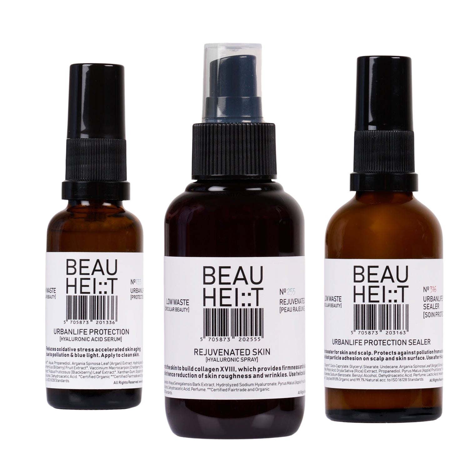 The Detox Bundle for Urban Skin from Beauheit is designed to purify and shield your skin, featuring Rejuvenated Skin № 255 to provide firmness and build collagen, Urbanlife Protection № 133 to defend against pollution and UV damage, and Urbanlife Protection Sealer № 316 to lock in hydration with a protective barrier.