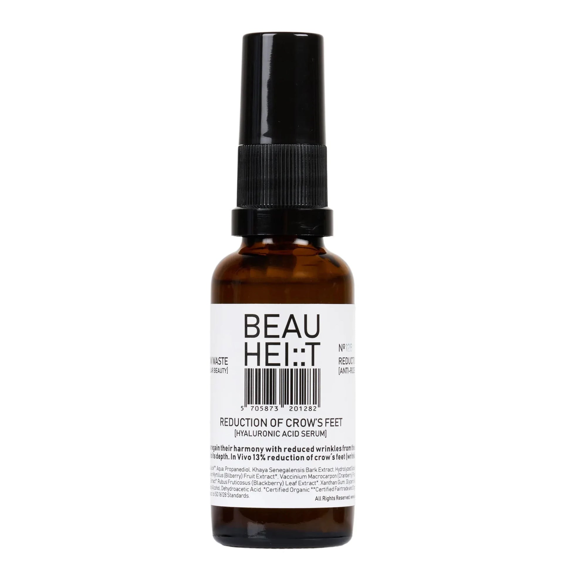 BEAUHEI::T Reduction of Crow’s Feet Booster targets fine lines and wrinkles around the eyes with a potent blend of carotenoids from bear garlic and blackberry, polyphenols from African mahogany bark, and hyaluronic acid.