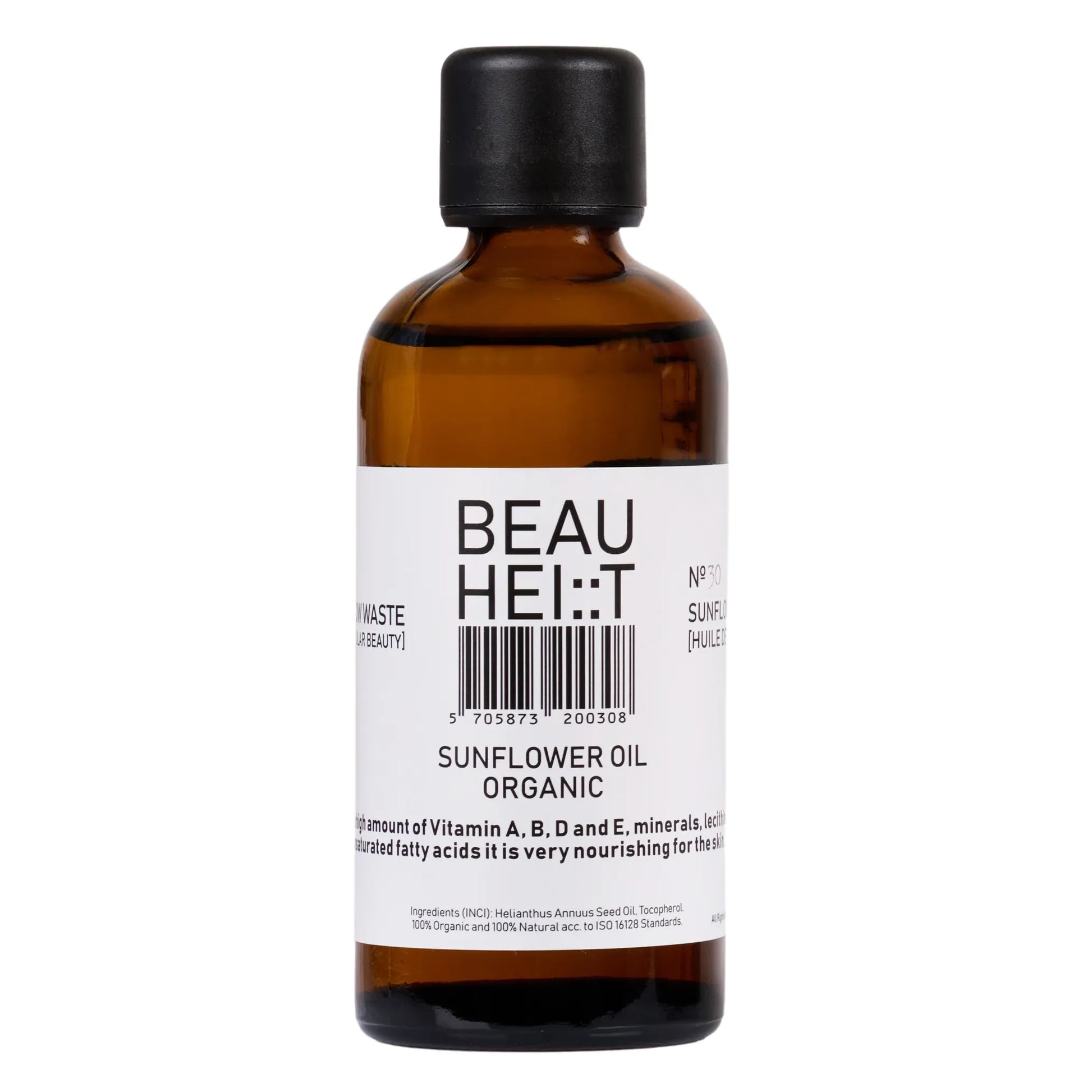 Organic Sunflower Oil är en mild, lätt hudvårdsolja som kan användas på en mängd olika sätt som basolja. Det har en antiinflammatorisk och skyddande effekt. En mångsidig olja som kan användas på alla hudtyper, även fet hud eftersom det är en torr olja. Den kan användas på storporig hud, hud med akne eller eksem. Används i hårvård som BEAUHEI::T balsam för strukturellt skadat hår som ger näring och stärker håret.
